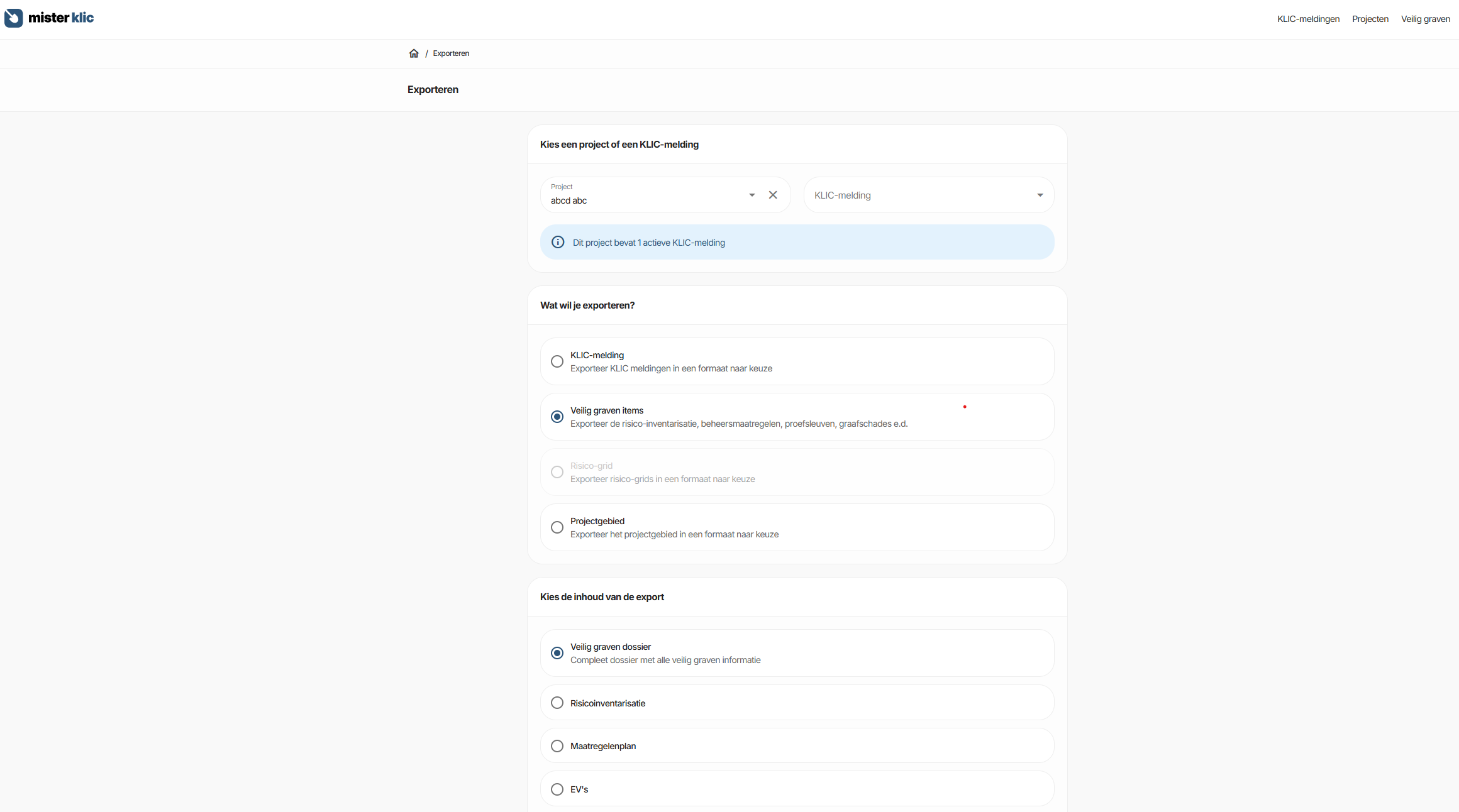 Op deze pagina moet je een project of KLIC-melding kiezen waar je iets uit wilt exporteren. Vervolgens kun je de KLIC-meldingen zelf, alle veilig graven items (de risico-inventarisatie, het maatregelenplan, de werkinstructies, de geregistreerde proefsleuven, et cetera), de risicogrids en projectgebieden eenvoudig exporteren in alle gewenste formaten. Hebben we hier een formaat in gemist? Laat het ons vooral weten! Voor alle veilig graven items is nu overigens ook een PDF beschikbaar. Heb je één rapport met alles omtrent veilig graven (CROW 500) nodig? Kies dan voor het veilig graven dossier!