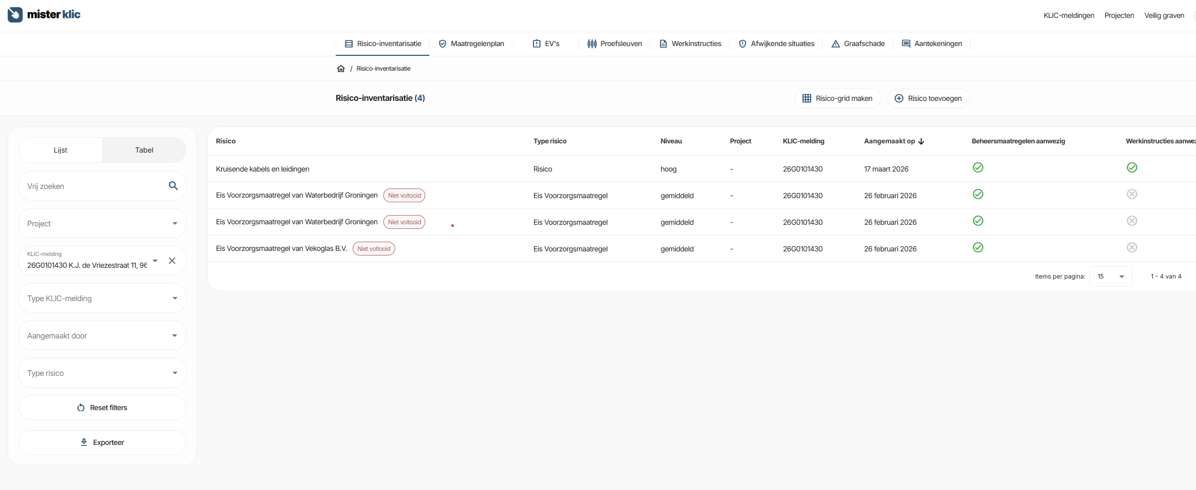 Het is nu mogelijk om binnen Mister KLIC een risico-inventarisatie uit te voeren en je maatregelenplan samen te stellen. Je stelt de risico-inventarisatie samen door zélf risico's te identificeren op de kaart en deze in te tekenen. Voor elk risico kun je aangeven wat het risico inhoudt en hoe groot je dit risico vindt. Vervolgens stel je een maatregelenplan op door een beheersmaatregel bij elk risico te registreren. Zo kun je als opdrachtgever snel en eenvoudig een risico-inventarisatie en maatregelenplan opstellen dat je, dankzij onze handige export-functionaliteit, eenvoudig als PDF met de uitvoerder kunt delen. Je vindt de risico-inventarisatie en het maatregelenplan op de Veilig graven-pagina,
