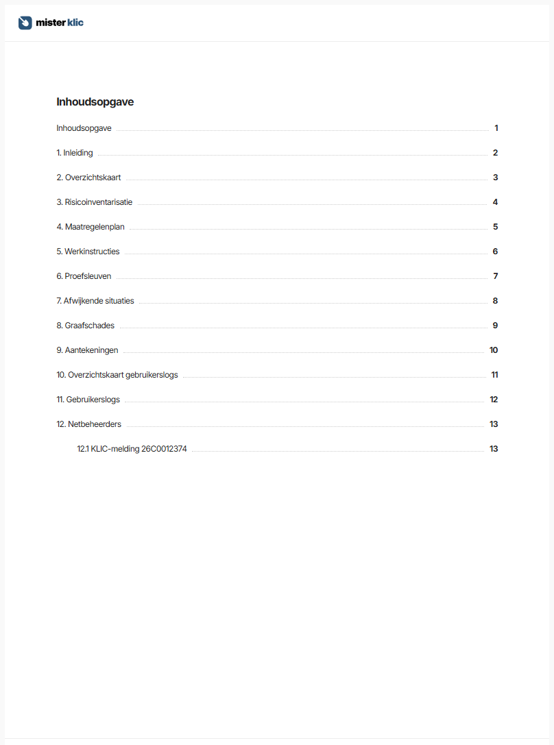 In het nieuwe veilig graven dossier vind je de volgende zaken onder elkaar in één overzichtelijke PDF: een overzichtskaart, de risico-inventarisatie, het maatregelenplan, de werkinstructies, de geregistreerde proefsleuven, afwijkende situaties, eventuele graafschades, aantekeningen, de gebruikerslogs (wie heeft wanneer welke KLIC-melding geopend) en de contactgegevens van alle netbeheerders die een kabel of leiding in het gebied hebben geregistreerd. Zo heb je de gehele registratie van alles wat je hebt gedaan om veilig te graven in één document beschikbaar! Al deze veilig graven items kun je trouwens ook gewoon als Excel, DWG of Shapefile exporteren.