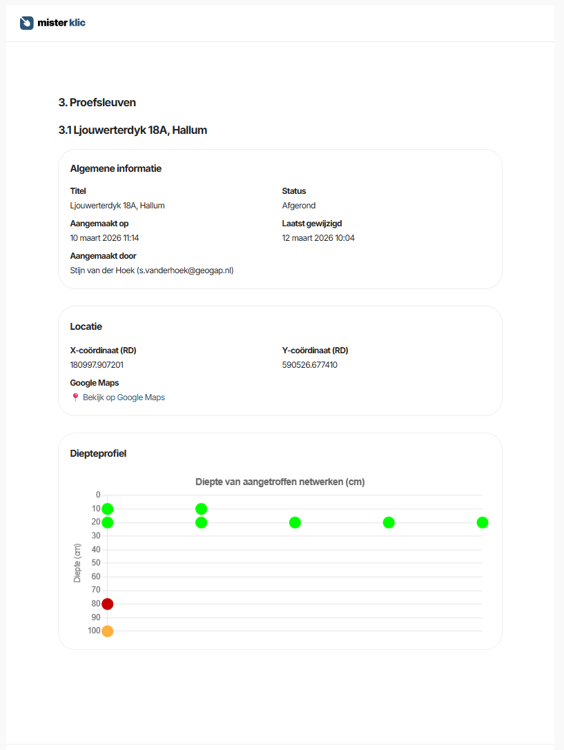 Op veler verzoek hebben wij een diepteprofiel aan de proefsleuf PDF toegevoegd. Zo zie je in één overzicht snel en duidelijk op welke dieptes er kabels zijn gevonden in de proefsleuf en kun je dit ook helder aan anderen communiceren. Ook de foto's gemaakt bij de proefsleuf vind je terug in de PDF over de proefsleuf.